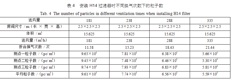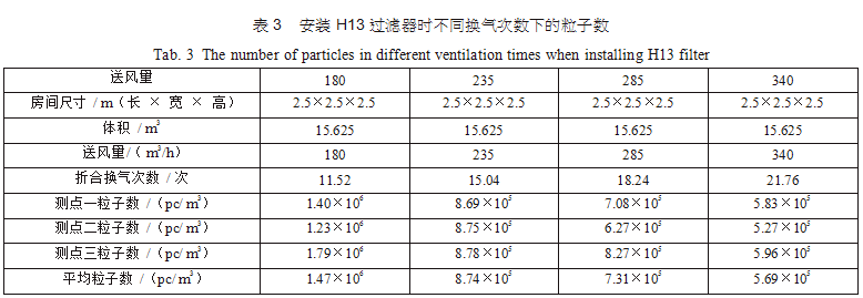 在空調機房中新建了三間2.5m×2.5m×2.5m的潔凈間,從空調主風管引風,每支支管設置調節 閥,并設排風機進行全排,送回風口及測點布置分別如圖 3(每點取樣三次,取平均值)。考慮到初中效過濾器對最后潔凈度的影響和最后理論塵埃數量 計算的方便,試驗用初中效繼續分別為G4、F8,三個房間分別安裝高效過濾器,風量500m3/h,第一組數據為送風量按GMP 驗證指南推薦換氣次數保持不變,分別用H12、H13、H14、U15過濾器,第二組數據為采用H13高效過濾器,調節風量 ;第三組數據為采用H14高效過濾器,調節風量,分別測得塵埃粒子數,并列表得出不同的換氣次數下對應的塵埃數如表2、表3、表4。